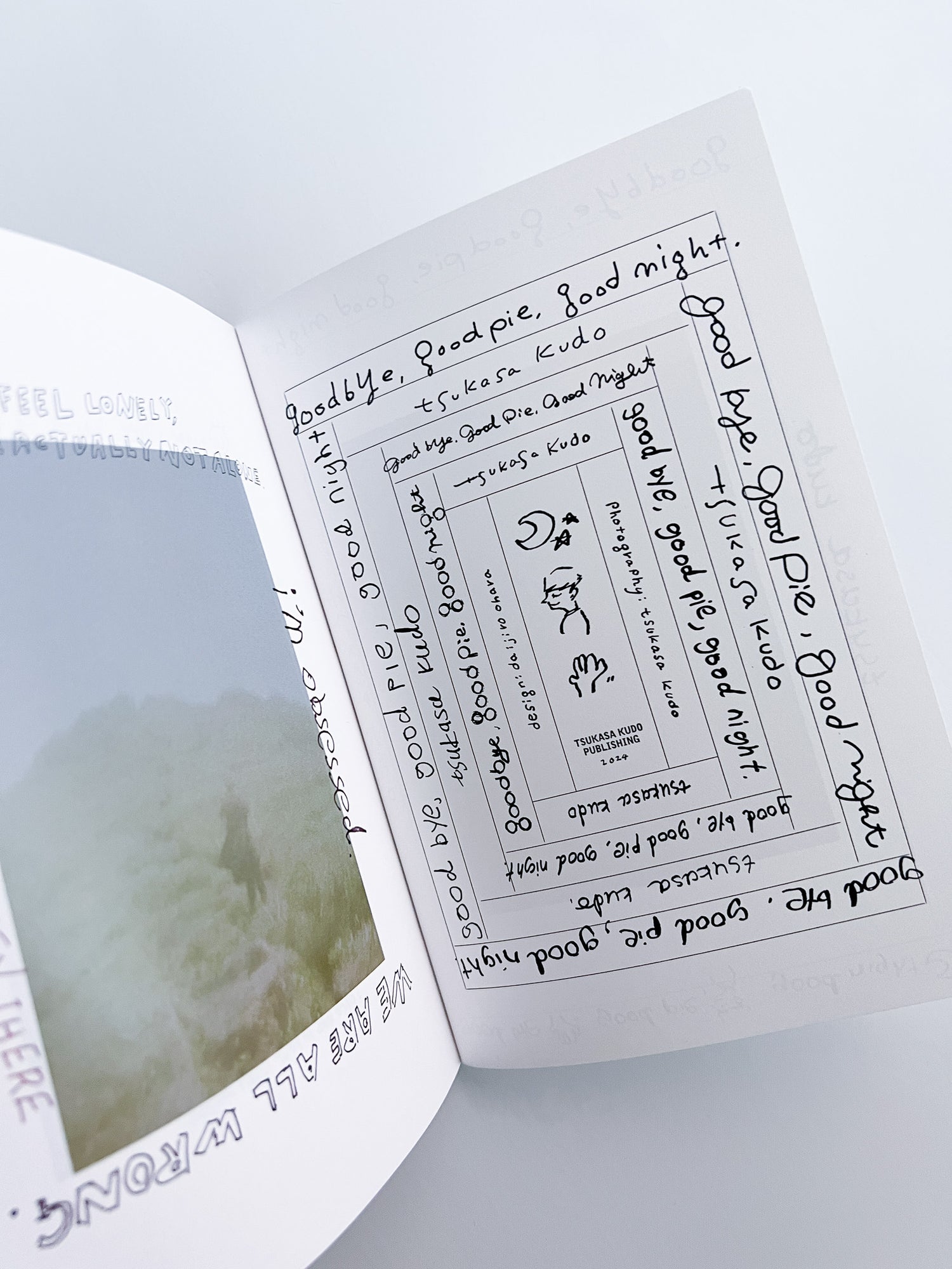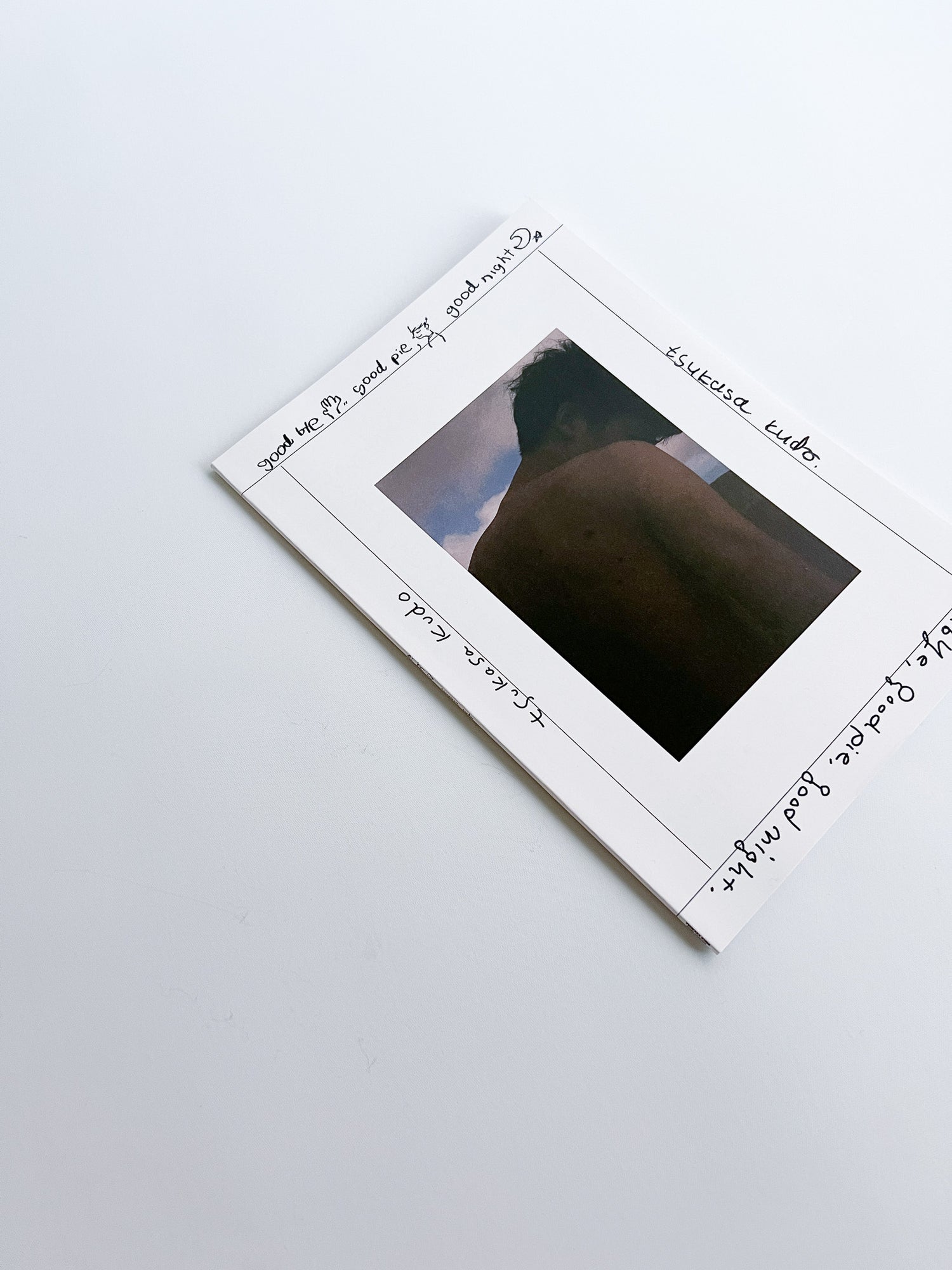 This ZINE by photographer Tsukasa Kudo features a collection of works shot in Hachijojima and Izu Oshima. The images were captured on film that had been unintentionally light-struck by repeated X-ray inspections during his trip to Europe. Designed by graphic designer Daijiro Ohara, the cover showcases the title and credits, uniquely handwritten in alternating turns by both the designer and the photographer.